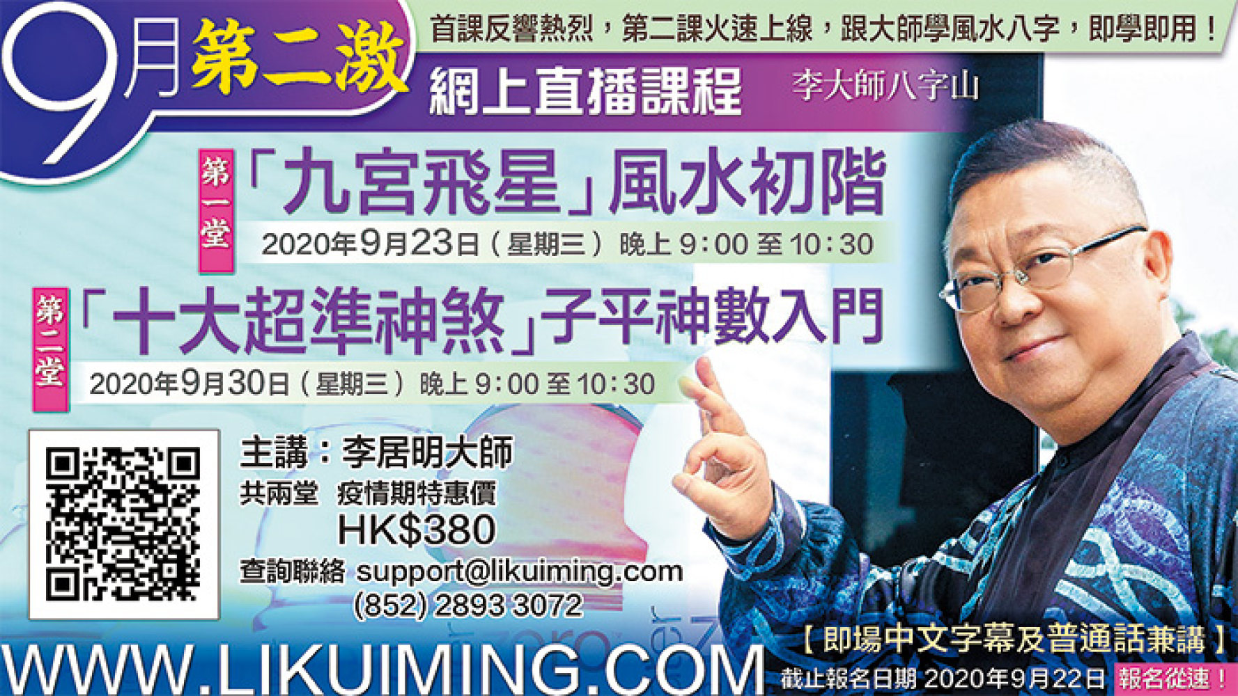 我的第二個網課又開班了。第一課是「九宮飛星」,第二課是「十個超準神煞」將在九月廿三日、三十日一連兩個星期三晚上網上直播,希望你來聽課。怎樣教八字是有技術的,你若從未學過風水和八字,這是一個最好的機會,我用最簡單方法,好快就教到你懂!這次會有即時中文字幕,粵語和普通話兼講,馬上登入官網www.likuiming.com 報名吧!上次錯過了,今次不要再失機會!