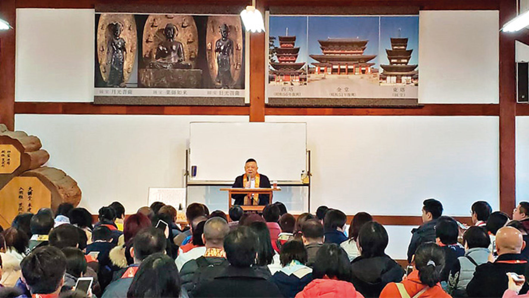 我在日本藥師寺,向讀者弟子及團友,講述旅遊教室及藥師法門的玄妙。希望藥師法快點在中國推動起來。抄心經的大願也希望盡快在祖國流行及扎根下來。