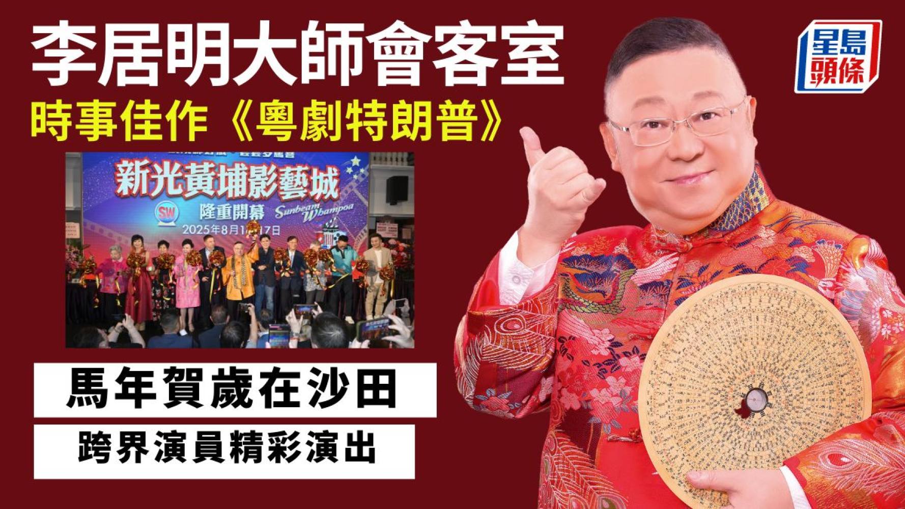 粵劇亦是火,我向大家宣布,時事粵劇《粵劇特朗普》馬年賀歲版將於沙田大會堂隆重公演,新加入跨界演員劇情更時事、更出位,揭開「新光粵劇節」序幕,密切留意開賣日期。「新光黃埔」首輪中西猛片之後,還有更多好片陸續上映。請留意cityline 最新放映排期。