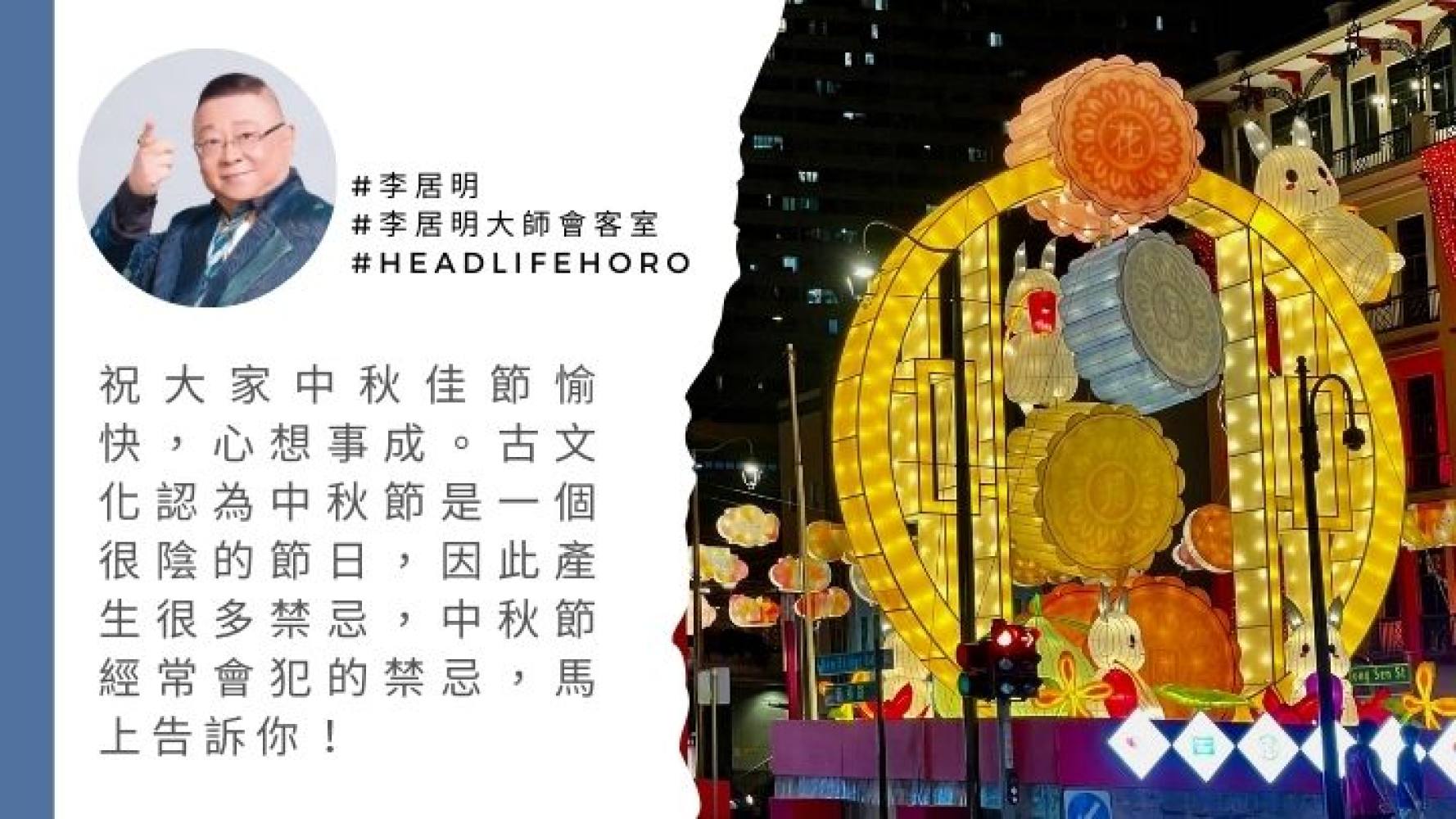 近年來我見到很多店家做了錯誤的月餅,月餅一定要圓形的,因為是應月圓之夜,代表團圓、圓滿。所以,術家認為月餅不可以做四方的,四方代表是非口舌,是不符合月餅的傳統文化和含義。四方月餅若做了圓角,也算過關。今晚你吃一個四方形的月餅化解的方法說一句「我要做主角」,應個「角」字便可!