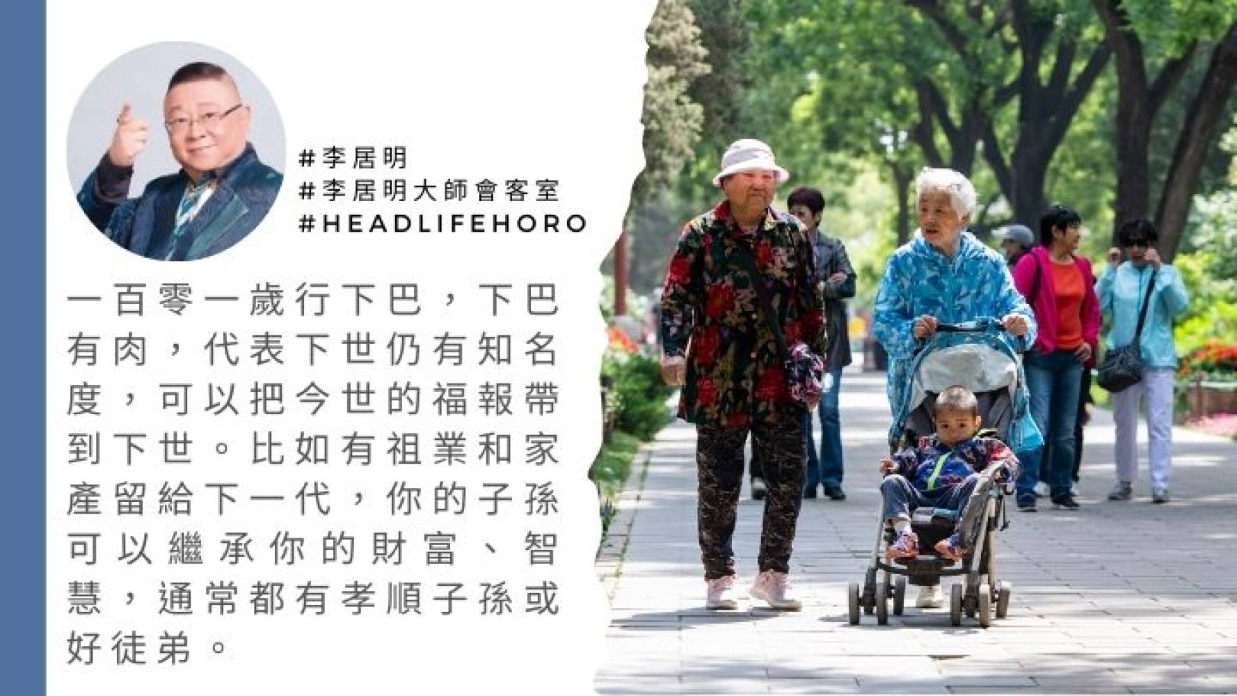 一百零一歲行下巴,下巴有肉,代表下世仍有知名度,可以把今世的福報帶到下世。比如有祖業和家產留給下一代,你的子孫可以繼承你的財富、智慧,通常都有孝順子孫或好徒弟。百年老字號的家族產業、大文學家、開山立派的人、開佛堂的人,通常都有飽滿的下頜,代表會有傳人,可將品牌、智慧延續至下一代。做術數的人,很希望有雙下巴,是下一世的延續之相學。