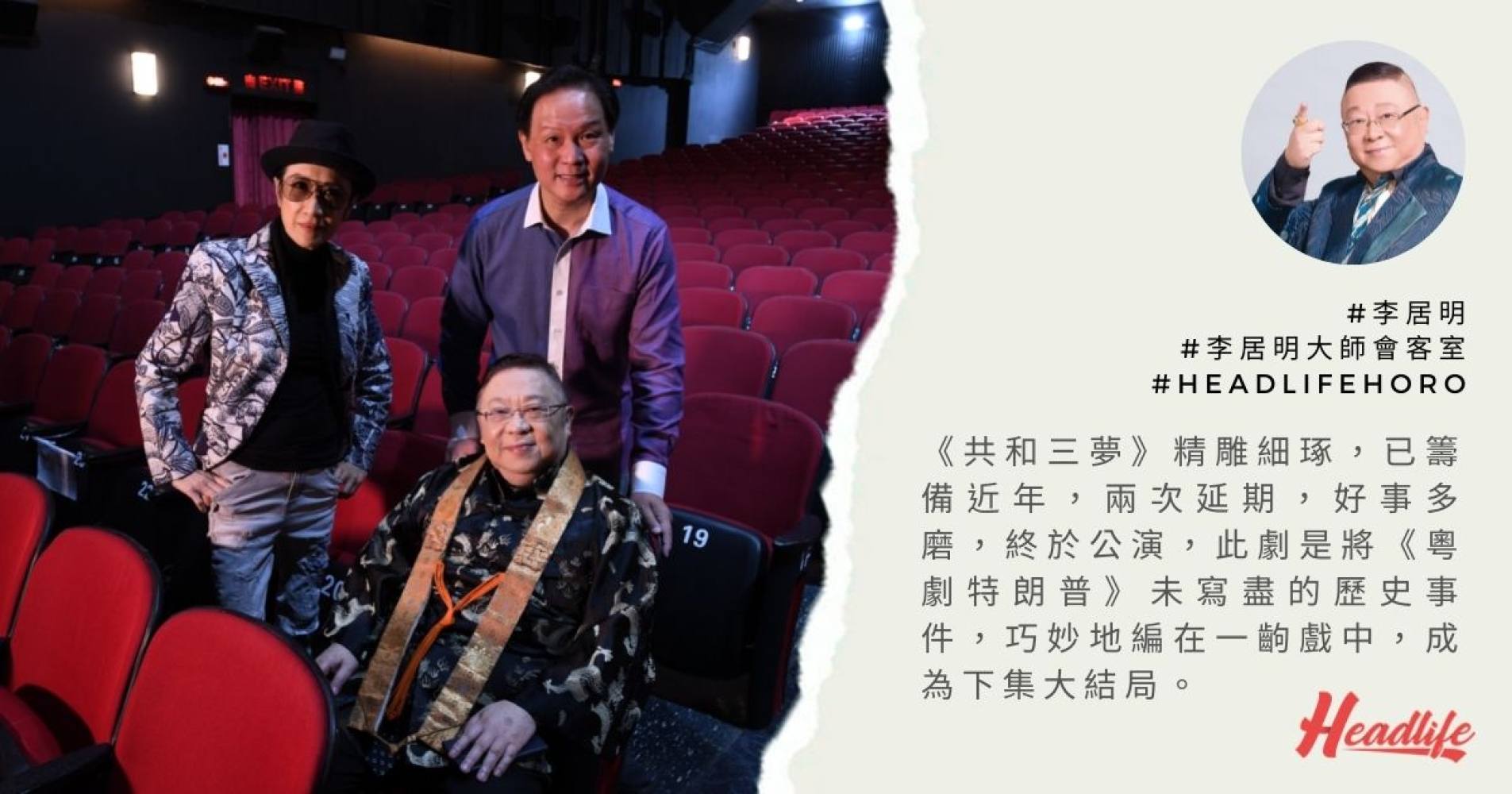 《共和三夢》精雕細琢,已籌備近年,兩次延期,好事多磨,終於公演,我的圈中朋友得此喜訊,都興奮不已,此劇是將《粵劇特朗普》未寫盡的歷史事件,巧妙地編在一齣戲中,成為下集大結局。《粵劇特朗普》有「外國人」和「外星人」的現代科幻元素包裝傳統粵劇,吸引不少從來入過新光看粵劇的年輕觀眾。當我在構思《共和三夢》時,當然也要讓年輕人有戲追。因此,將中國近代史中最有趣的東西、大家最有興趣的人物搬上粵劇舞台。相信此劇又一次繼《粵劇特朗普》有大量年輕觀眾入場。