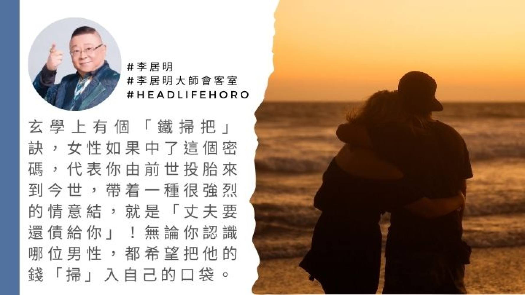 玄學上有個「鐵掃把」訣,與前世有關,特別是針對女性。所有女性如果中了這個密碼,代表你由前世投胎來到今世,帶着一種很強烈的情意結,就是「丈夫要還債給你」!無論你認識哪位男性,都希望把他的錢「掃」入自己的口袋。你是女性,是否羨慕這種「鐵掃把」呢?