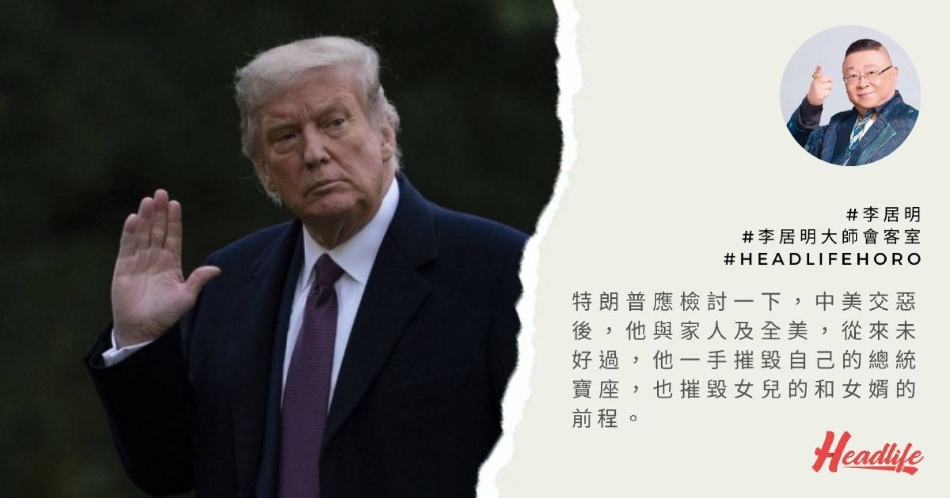 特朗普應檢討一下,中美交惡後,他與家人及全美,從來未好過,他一手摧毀自己的總統寶座,也摧毀女兒的和女婿的前程。這是用中國的「子平神數」看到這個的玄機,特朗普是不明白的。無論事態發展如何,拜登一登台,全世界都可以唞唞氣。自從特朗普上台後,我們從未行運過。「特朗普」三個字太累了,大家都見到你都累了!