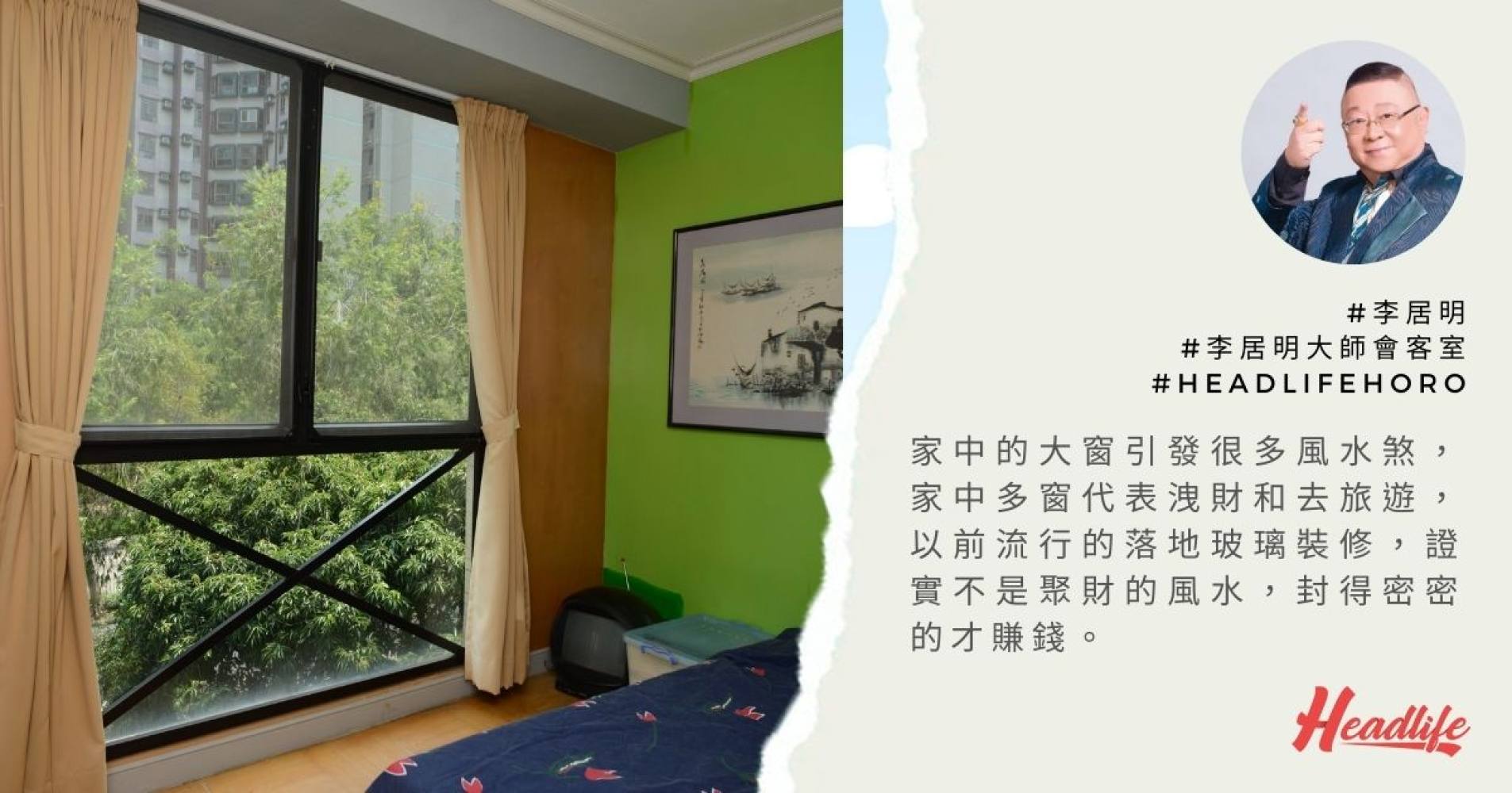 家中的大窗引發很多風水煞,家中多窗代表洩財和去旅遊。所謂西北西南有隻破財窗,代表財富不會留在家中,一定要馬上關掉,或加窗簾和櫃子!以前流行的落地玻璃裝修,證實不是聚財的風水,封得密密的才賺錢,這是外國名牌店的成功格局。住宅更加不應該用落地玻璃,會惹來私隱被揭之煩惱。