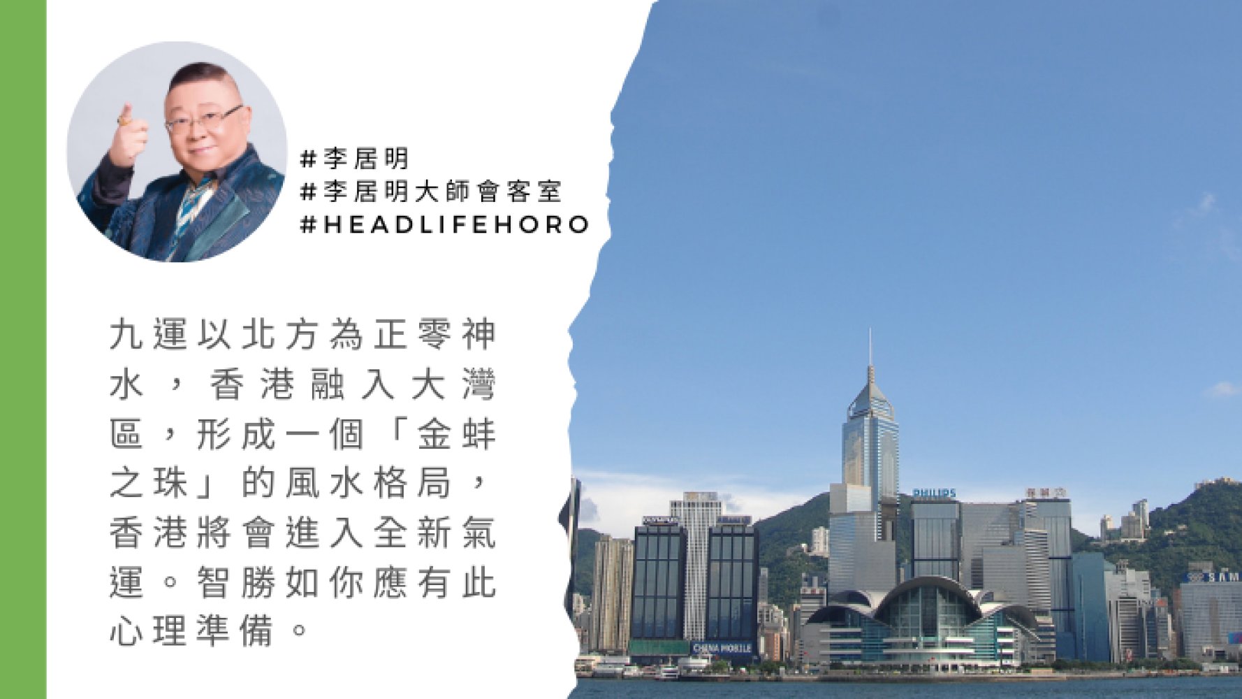 九運以北方為正零神水,香港融入大灣區,形成一個「金蚌之珠」的風水格局,香港將會進入全新氣運。智勝如你應有此心理準備。