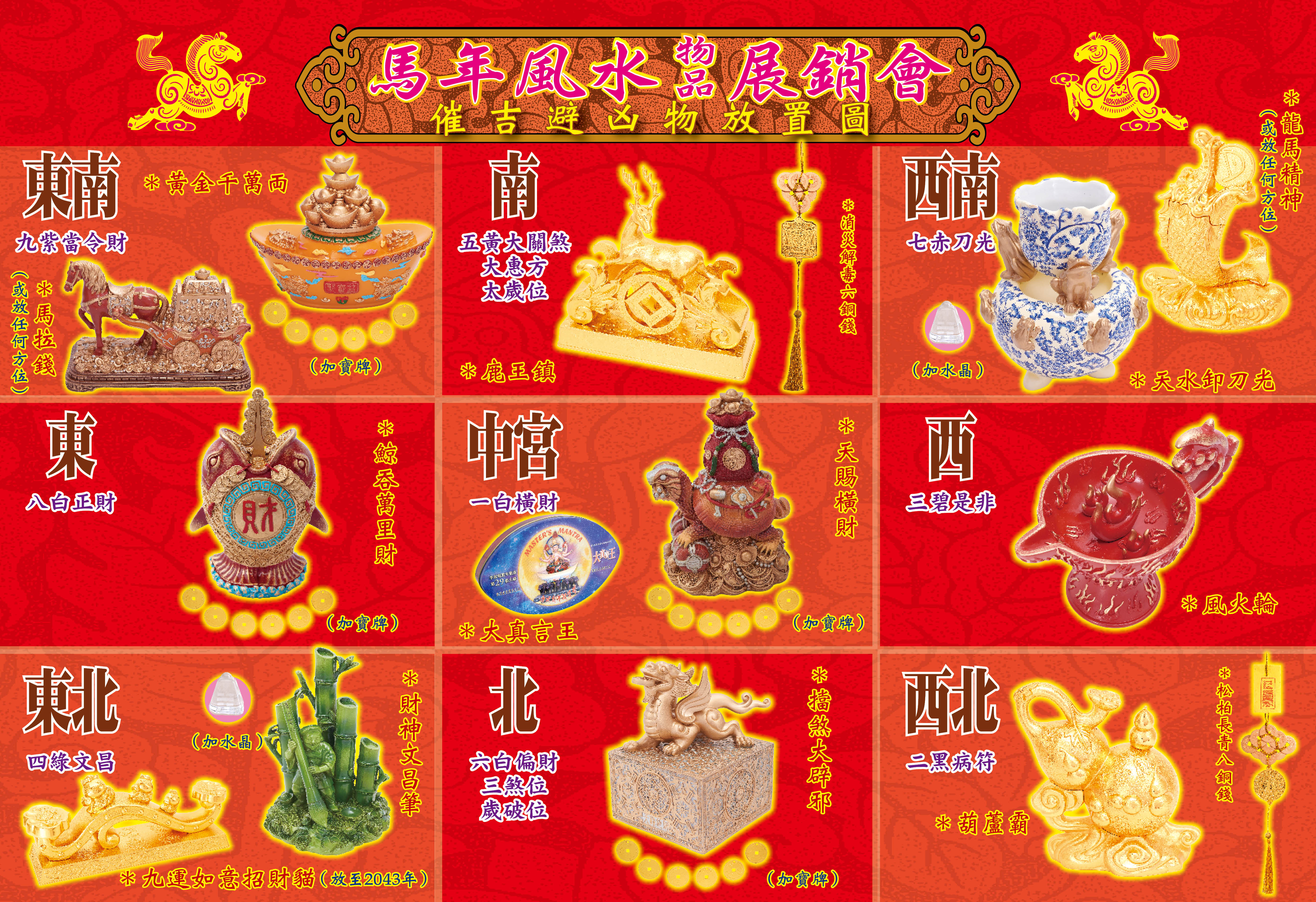 - 生旺偏財橫財,中宮擺放「天賜橫財」,龍龜救一白水星出囚,催旺金股炒賣和添丁星,正北方擺放「擋煞大辟邪」,辟邪獸化三煞招六白偏財星入宅,馬年最旺偏財,要好好把握。