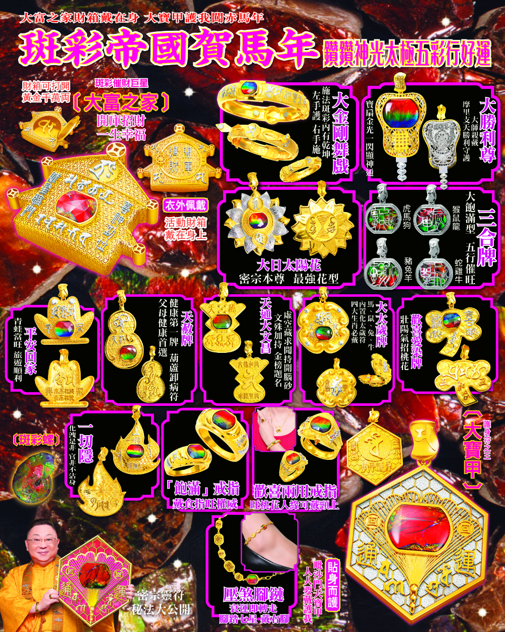 - 馬年是財富年,馬年招財首選大寶樓閣形的「大富之家」財盒催財最快。「大日太陽花」、「平安回家」、「一切隱」及「歡喜愛染牌」各具不同功能的護身符,加持力不可思議。「天赦牌」保父母健康長壽。