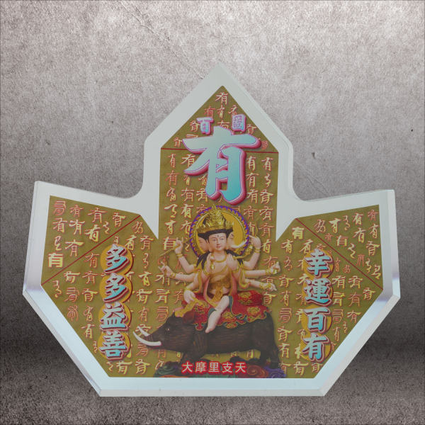 - 「百有圖」守護本尊為密宗「大摩里支天」,不但加持眾生獲得百戰百勝,又能消除百種劫難,令眾生獲得財富之際亦無後顧之憂,用上「摩里支天九字切」圖騰令此牌功力更勝一籌。再加上「光明加持」「百無禁忌」八字對聯,任何陰性磁場都得到清淨,可謂是獨一無二的「密宗鎮宅圖」。
