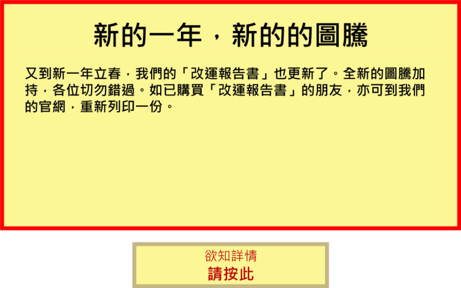 又到新一年立春,我們的「改計報告書」也更新了。全新的圖騰加持,各位切勿錯過。如已購買「改計報告書」的朋友,亦可到我們的官網,重新列印一份